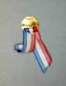 Hanging from the reverse of the badge are two lengths of red, white, blue striped ribbon, with "HONOR GUEST" stamped in gold on the top ribbon.
