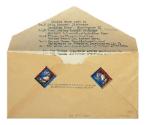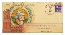 DescriptionA stamp cover commemorating the bicentennial of Thomas Jefferson's birth. The hand designed and colored cachet on the left side of the buff-colored envelope has a profile portrait of Thomas Jefferson within a circle surrounded by a laurel leaf wreath. To the left of the portrait is the image of an eagle sculpture seated on a stars and stripes pedestal. Text above and below Jefferson's portrait reads: • 1743 ~ Thomas Jefferson ~ 1943 • / • Bicentennial • / ARCHITECT OF DEMOCRACY. The address box is also part of the cachet design, as is the designated box for the postage stamp with an eagle drawn over it. Printed and handwritten along the top of the envelope: LIMITED ISSUE • NO. 1 OF 30.
