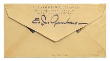 The return address is on the reverse: "E. J. GAMBRO, DESIGNER / 91 CHRISTOPHER STREET / NEW YORK CITY (14) N.Y." followed by the artist's original ink signature: "E. J. Gambaro." Also on the reverse are two 1943 non-postal Season's Greetings stamps and a black ink stamped message that reads: FROM THE FRANKLIN D. ROOSEVELT COLLECTION / AUTHENTICATED BY H. R. HARMER INC., N. Y. The circled number "R12" and the note "MISC. 262" are both written in pencil in the lower right corner. Typed on the interior of the envelope flap is a list of where copies no. 2-11 of the commemorative cover were sent.