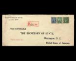 DescriptionA white stamp cover from the American Consular Service in Foochow, China. The envelope is addressed to (pre-printed): THE HONORABLE / THE SECRETARY OF STATE, / Washington, D. C. / United States of America. The return address is in the upper left corner. Adhered in the upper right corner of the envelope is a Chinese 1933 green 5c Dr. Sun Yat-sen postage stamp (Scott 299), a Chinese 1931-1937 blue 25c Dr. Sun Yat-sen postage stamp (Scott 303), and a Chinese 1934 green 50c Ch'en Ying-shih postage stamp (Scott 323). The postmark is unreadable. The envelope is stamped "REGISTRED" in red ink, and also has a red and white paper registration label.
