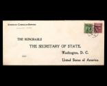 DescriptionA white stamp cover from the American Consular Service in Yunnanfu, China. The envelope is addressed to (pre-printed): THE HONORABLE / THE SECRETARY OF STATE, / Washington, D. C. / United States of America. Typed to the left of the address: Visa. The return address is in the upper left corner. Adhered in the upper right corner of the envelope is a Chinese 1933 green 5c Dr. Sun Yat-sen postage stamp (Scott 299), and a Chinese 1923 red 20c Reaping Rice postage stamp (Scott 262). The postmark is unreadable.