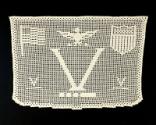 DescriptionA white crocheted antimacassar intended to cover the back of an upholstered chair. At the center is a large letter "V" with "• • • −" ["V" in Morse Code] beneath it. Flanking both sides of the large "V" are two smaller versions. Above the large "V", from left to right, are images of an American flag, an eagle with outstretched wings, and a patriotic shield.