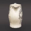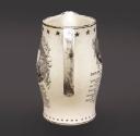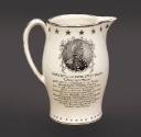 DescriptionA white, glazed ceramic transferware pitcher commemorating the 1812 naval battle between the ships USS CONSTITUTION and HMS JAVA. Both the mouth and base of the pitcher are edged by a painted silver band and a row of silver stars. The handle is also detailed with silver paint.