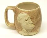 DescriptionA glazed ceramic beer mug with a brown spatter finish. On the side of the mug is a raised caricature portrait of Franklin D. Roosevelt. On the opposite side of the mug is the slogan: HAPPY DAYS / ARE HERE / AGAIN. Inscribed on the underside of the mug: STANGL / 1647-1.