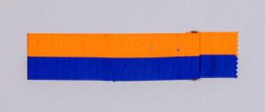 DescriptionA royal blue and orange fabric hatband with a metal adjuster. Stamped in white paint on one end of the hatband is an image of the Trylon and Perisphere with the words: 1939 / NY WORLD'S FAIR / © N.Y.W.F.