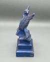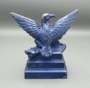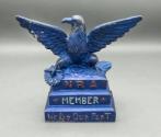 DescriptionA hollow, cast metal statuette featuring the Blue Eagle symbol from the National Recovery Administration (NRA) logo. The painted blue statuette consists of the eagle, with outstretched wings, clutching a gear in its right talon (marked "U.S.") and bolts of lightning in its left talon. The eagle is perched on a tiered, three-step base with red and white wording on the front of each step: "NRA / ★ MEMBER ★ / WE DO OUR PART."
