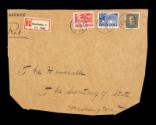 DescriptionA cutout from an American Consular Service envelope. The buff-colored envelope remnant has a partial address (handwritten in ink): “The Honorable / The Secretary of State, / Washington, D.” Above the address is a red and white registration sticker with “R / Stockholm 3 / N:r 1448.” Adhered at the top are three Swedish postage stamps: one 1935 carmine 15 öre Parish Church stamp (Scott 241), one 1935 ultramarine 25 öre House of The Nobility stamps (Scott 245), and one 1921 gray 50 öre King Gustav V stamp (Scott 185). The envelope is postmarked Stockholm, Sweden, February 12, 1935.