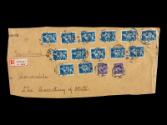 DescriptionA cutout from an American Consular Service envelope. The buff-colored envelope remnant has a partial address (handwritten in ink): “Registered / Honorable / The Secretary of State.” Above the address is a red and white registration sticker with “R / Göteborg 1 / N:r 4014.” Adhered at the top are 15 Swedish postage stamps: thirteen 1932 dark blue 25 öre Death of Gustavus Adolphus stamps (Scott 234), and two 1925 violet 10 öre Heraldic Lion Supporting Arms of Sweden stamps (Scott 119). The envelope is postmarked Göteborg (Gothenburg), Sweden, March 6, 1935.