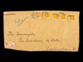 DescriptionA cutout from an American Consular Service envelope. The buff-colored envelope remnant is addressed to (handwritten in ink): “The Honorable / The Secretary of State, / Washington, D.C.” To the left of the address is a red and white registration sticker with “R / Göteborg 1 / N:r 4265.” Adhered at the top are five 1921 deep orange 1 krona Crown and Post Horn stamps (Scott 153). The envelope is postmarked Göteborg (Gothenburg), Sweden, February 7, 1935.