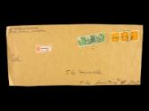 DescriptionA cutout from an American Consular Service envelope. The buff-colored envelope remnant has a partial address (handwritten in ink): “The Honorable / The Secretary of State.” Above the address is a red and white registration sticker with “R / Stockholm 3 / N:r 1870.” A partial stamped and written return address is in the upper left corner: “[AMER]ICAN CONSULAR SERVICE / Stockholm, Sweden.” Adhered in the upper right are six Swedish postage stamps: three connected 1933 green 5 öre Catching Sunlight in Bowl stamps (Scott 236), and three connected 1921 deep orange 1 krona Crown and Post Horn stamps (Scott 153). The envelope is postmarked Stockholm, Sweden, March 23, 1934.