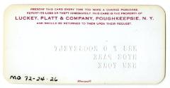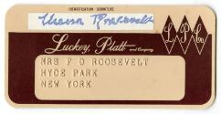 DescriptionA Luckey, Platt & Company, Poughkeepsie, N. Y. credit card made out to: Mrs F D ROOSEVELT / HYDE PARK / NEW YORK. There is no account number, expiration date, or signature. The reverse side has printed usage information.
