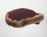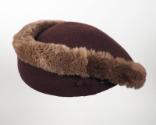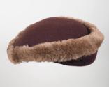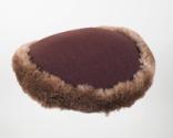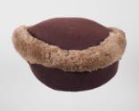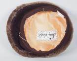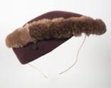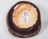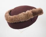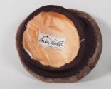 DescriptionA low-profile brown hat, gradually longer on one side, made of wool knit fabric and edged all the way around with lighter brown mouton fur. The interior of the hat is lined with peach silk on which is sewn the white fabric maker's label that reads: Sally Victor ® / NEW YORK. An elasticized cord runs the interior width of the hat. Inserted into the exterior of the hat is a metal hatpin with a matching brown fabric head.