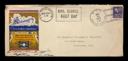 Additional DetailsThe envelope is addressed to (typed): "The President Franklin D. Roosevelt, / The White House / Washington, D.C." There is no return address. Adhered in the upper right of the envelope is a U.S. 1938 purple 3¢ Thomas Jefferson stamp (Scott 807). The envelope is postmarked twice: U. S. S. NORTH CAROLINA, April 9, 1941 with a "MAIL SERVICE / FIRST DAY" cancellation, and U. S. S. NORTH CAROLINA, April 14, 1941.