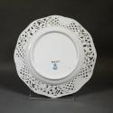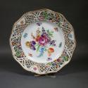 DescriptionA dessert plate in the Schumann Chateau Dresden floral pattern. The white plate has a scalloped edge and a reticulated (pierced) rim. Painted at the center of the plate and on the rim are a variety of colorful flowers and leaves. The edge of the plate is trimmed in gold and there are gold accents on the rim.