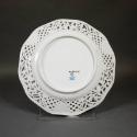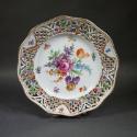 DescriptionA dessert plate in the Schumann Chateau Dresden floral pattern. The white plate has a scalloped edge and a reticulated (pierced) rim. Painted at the center of the plate and on the rim are a variety of colorful flowers and leaves. The edge of the plate is trimmed in gold and there are gold accents on the rim.