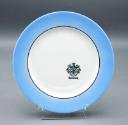 DescriptionA salad or dessert plate in the Rho Dendra pattern in blue. The pattern consists of a white well separated from the broad blue lip of the plate by a narrow black band. The design of the plate has been customized with the addition of the Roosevelt coat of arms and name in black on the right side of the well.