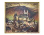 DescriptionOil painting on canvas of the Castle of Clervaux built on a rock overlooking a village. The castle is in the forefront of the painting, while in the background a hill rises above it with another large building at the peak. Signed and dated lower right: "J. Meyers '39" [1939]. On right side of frame (underneath black trim piece) is attached a small blue, orange, and white printed U.S. Customs 1939 New York World's Fair Exhibit sticker identifying the painting as "Entry No. 708" and "Case No. 55" [number written in ink]. Painting framed in 1 1/2" gilt wood frame.