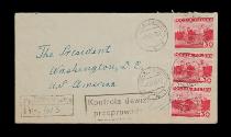 DescriptionA cream-colored stamp cover from Poland addressed to (handwritten in blue ink): The President / Washington, D. C. / U.S. America. Adhered along the right side of the envelope are three Polish 1935 rose red 30g Castle in Mira stamps (Scott 299). The envelope is postmarked and registered Zabno K. Tarnowa, Poland, March 1937.