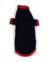 DescriptionA blue and red knitted dog sweater. The body of the sweater is dark blue with red trim. There is a large, folded collar opening for the head, and two short sleeves for the front legs. The sweater fastens with five red buttons that run down the length of the shorter underside (stomach side).