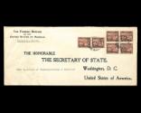 DescriptionA white stamp cover from the Foreign Service of the United States in Valletta, Malta. The envelope is addressed to (pre-printed): THE HONORABLE / THE SECRETARY OF STATE, / Washington, D. C. / United States of America. Typed to the left of the address: (For Division of Communications & Records). The return address is in the upper left corner. Adhered in the upper right corner of the envelope are six Maltese 1938-1942 brown 1f Grand Harbour postage stamps (Scott 191). The envelope is postmarked Valletta, Malta, 1939.