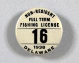 DescriptionA round pinback 1938 license button allowing for non-resident fishing in Delaware. Black text on the white button reads: NON-RESIDENT / FULL TERM / FISHING LICENSE / 16 / 1938 / DELAWARE.
