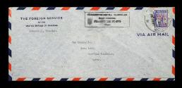 DescriptionA white air mail stamp cover from the Foreign Service of the United States in Guayaquil, Ecuador. The envelope is addressed to (typed): The Honorable, / Boaz Long, / American Minister, / Quito. The return address is in the upper left corner. Adhered in the upper right of the envelope is an Ecuadorian 1936 blue 3c Worker postal tax stamp (Scott RA 35) with a surcharge stamped in red: AERO SEDTA 0,65. The envelope has an illegible postmark along with a stamped consular correspondence "FRANCO DE PORTE" ink stamped message.