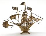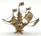 DescriptionA model of a Portuguese caravel ship made of gold filigree. The three-masted, elaborately decorated sailing ship has a small hull and sails unfurled with red and white crosses on the sails. The model is fixed to a matching gold filigree stand.