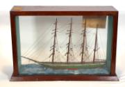 DescriptionA model of the four-masted ship, WILLIAM P. FRYE. The wooden ship has a white, green and red painted hull with the name of the ship painted at both sides of the bow. There are no sails. The model is mounted inside a wood and glass case, the interior base of which is covered in blue and white painted cotton representing the sea. A paper tag, formed from a piece of White House stationery, is attached to an exterior side of the case and has a handwritten note in pencil: From / President / Office / 270.