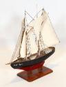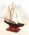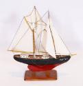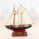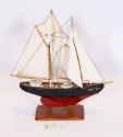 DescriptionA ship model of the Gloucester fishing schooner, GERTRUDE L. THEBAUD. The wooden sailboat has a hull painted black and red with white trim and two masts with unfurled sails made of paper. The model is fixed to a stained wooden cradle stand.