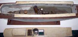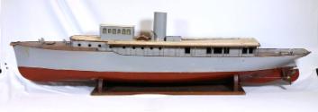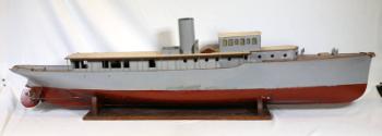 DescriptionModel of a motorized yacht. The wooden boat has a gray and maroon painted hull, single smokestack, and dual propellers. The entire deck structure lifts off to reveal the steam plant and inner mechanisms. Model sits on a stained wood cradle base.