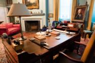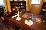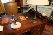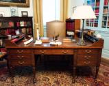 Label TextThis desk is a 1963 copy of the desk used by President Roosevelt in his private Study in the Roosevelt Library. The original desk - a replica of one once owned by George Washington - was removed by FDR's son, James, after the President's death. Roosevelt purchased that desk in 1918 for President Woodrow Wilson while he was serving as Wilson's Assistant Secretary of the Navy. It was part of a set of furnishings FDR bought to outfit Wilson's quarters aboard the USS GEORGE WASHINGTON, the ship Wilson used to travel to Europe to attend the Paris Peace Conference at the end of World War I. Years later, when the ship's furnishings were auctioned off, FDR purchased the desk. He later installed it in his Study. This copy of the original desk is on display in FDR’S PRIVATE STUDY in the Permanent Exhibit.Additional Details