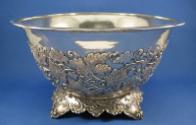 DescriptionA silver footed bowl with applied cast and chased silver elements. The bowl has been polished and lacquered. Inscribed on the underside: Presented to the Honble / John W. Davis / by the / American Merchants / of Canton / as a token of their esteem / Canton, May 16, 1850. Maker's marks on the underside consist of a lion passant, date "L" (which represents 1866-67), "CU," a leopard's head, and a sovereign's head.