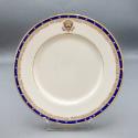 DescriptionA Lenox salad plate from the Franklin D. Roosevelt White House china service. On an ivory background, the pattern consists of an outer border of 36 gold stars on a gold-lined blue band, and an inner border of gold roses and feathers (inspired by the Roosevelt family crest) with the Seal of the President of the United States in color at the top.