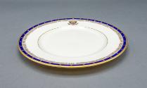 Label TextAs a result of continued breakage of porcelain dinnerware at the White House over the years, First Lady Eleanor Roosevelt announced in November 1934 that a new set of Lenox china would be purchased. The set consisted of 1,722 pieces and cost $9,301.20. As part of her promotion to keep American workers employed during the difficult economic times, Lenox – located in Trenton, New Jersey – was chosen since it was an American manufacturing company. The pattern, designed after a general pattern suggested by President Roosevelt, includes a border of gold stars and the presidential seal in enamel colors on an ivory body. The stars are set against a band of marine blue (personal to the Roosevelts because of President Roosevelt's interest in nautical subjects) and complemented by an inner band of golden roses and feathers reminiscent of the Roosevelt family crest. Lenox worked overtime so that the large set of china would be completed in time for an important state dinner in January 1935. The service made its debut on January 24, 1935 at the annual dinner given for the heads of diplomatic missions in Washington. The set is still available for use at the White House to this day.