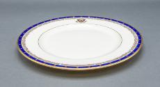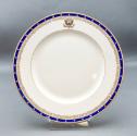 Label TextAs a result of continued breakage of porcelain dinnerware at the White House over the years, First Lady Eleanor Roosevelt announced in November 1934 that a new set of Lenox china would be purchased. The set consisted of 1,722 pieces and cost $9,301.20. As part of her promotion to keep American workers employed during the difficult economic times, Lenox – located in Trenton, New Jersey – was chosen since it was an American manufacturing company. The pattern, designed after a general pattern suggested by President Roosevelt, includes a border of gold stars and the presidential seal in enamel colors on an ivory body. The stars are set against a band of marine blue (personal to the Roosevelts because of President Roosevelt's interest in nautical subjects) and complemented by an inner band of golden roses and feathers reminiscent of the Roosevelt family crest. Lenox worked overtime so that the large set of china would be completed in time for an important state dinner in January 1935. The service made its debut on January 24, 1935 at the annual dinner given for the heads of diplomatic missions in Washington. The set is still available for use at the White House to this day.