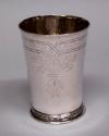 DescriptionA silver beaker engraved with vines and leaves. Near the top, engraved in a triangular format: W / S. A. A hallmark is on the underside of the cup: I A.