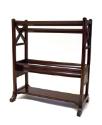 DescriptionA low, three-tiered wooden bookshelf with a dark finish. The first two tiers each consist of four horizontal wood slats arranged in a "V" shape to cradle books. The bottom tier consists of a flat shelf. Each end piece of the bookshelf is designed with an "X" design, in the center of which is a small, round inlaid wood medallion. A larger elliptical inlaid wood medallion is found on the lower section of each side piece. A thin inlaid wood band also decorates each post and cross section, as well as the bottom tier. The bookshelf is made to stand alongside a chair.