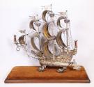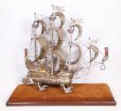 DescriptionAn ornate silver model (reputed to be from the 1600s) of an unidentified Swedish galleon. The three-masted ship has unfurled sails impressed with images of leaves and fish and four different coats of arms. On one side of the hull are the nude figures of mermaids and merchildren. The other side of the hull depicts two wild horses fighting a man. Three lanterns, each with a red plastic insert, are placed on the ship: one at the bow, one at the stern, and one on the quarterdeck. A fierce looking sea creature protrudes from the stern. Four other sea creatures form a stand, attaching the model to a velvet-covered wood base.
