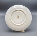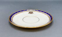 Label TextAs a result of continued breakage of porcelain dinnerware at the White House over the years, First Lady Eleanor Roosevelt announced in November 1934 that a new set of Lenox china would be purchased. The set consisted of 1,722 pieces and cost $9,301.20. As part of her promotion to keep American workers employed during the difficult economic times, Lenox – located in Trenton, New Jersey – was chosen since it was an American manufacturing company. The pattern, designed after a general pattern suggested by President Roosevelt, includes a border of gold stars and the presidential seal in enamel colors on an ivory body. The stars are set against a band of marine blue (personal to the Roosevelts because of President Roosevelt's interest in nautical subjects) and complemented by an inner band of golden roses and feathers reminiscent of the Roosevelt family crest. Lenox worked overtime so that the large set of china would be completed in time for an important state dinner in January 1935. The service made its debut on January 24, 1935 at the annual dinner given for the heads of diplomatic missions in Washington. The set is still available for use at the White House to this day.On the reverse of the plate, the manufacturer's and supplier's information is stamped in gold: THE WHITE HOUSE / 1934 / [Lenox logo] / LENOX / MADE IN U.S.A. / WM. H. PLUMMER & CO., LTD. / NEW YORK CITY.