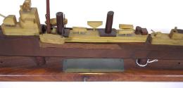 DescriptionA wooden model of a US destroyer. Made entirely of stained wood, the ship has one mast and two smoke stacks. The model is fixed to a natural wood base to which is mounted an inscribed metal plaque: THE HONORABLE FRANKLIN D. ROOSEVELT / MADE OF WOODS OF COSTA RICA. / FROM EDWIN F. THOMAS.