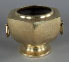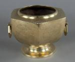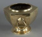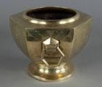 DescriptionA cast vase made of Korean brass with Hexagon-shaped riveted handles at the sides. The exterior surface is engraved with floral, swirls, and yin/yang designs. Inscribed around the top rim: President and Mrs. Roosevelt From Louise Yim Hahn, Seoul, Korea. The vase rests on a separate piece of circular leather.