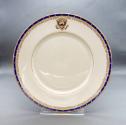 DescriptionA Lenox plate from the Franklin D. Roosevelt White House china service. On an ivory background, the pattern consists of an outer border of 48 gold stars (one for each state at the time) on a gold-lined blue band, and an inner border of gold roses and feathers (inspired by the Roosevelt family crest) with the Seal of the President of the United States in color at the top.