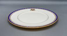 Label TextAs a result of continued breakage of porcelain dinnerware at the White House over the years, First Lady Eleanor Roosevelt announced in November 1934 that a new set of Lenox china would be purchased. The set consisted of 1,722 pieces and cost $9,301.20. As part of her promotion to keep American workers employed during the difficult economic times, Lenox – located in Trenton, New Jersey – was chosen since it was an American manufacturing company. The pattern, designed after a general pattern suggested by President Roosevelt, includes a border of gold stars and the presidential seal in enamel colors on an ivory body. The stars are set against a band of marine blue (personal to the Roosevelts because of President Roosevelt's interest in nautical subjects) and complemented by an inner band of golden roses and feathers reminiscent of the Roosevelt family crest. Lenox worked overtime so that the large set of china would be completed in time for an important state dinner in January 1935. The service made its debut on January 24, 1935 at the annual dinner given for the heads of diplomatic missions in Washington. The set is still available for use at the White House to this day.