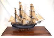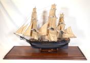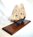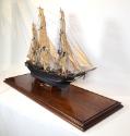 DescriptionA three-masted, square-rigged wooden model of the frigate, RALEIGH. The ship has a black and gray hull with white and gold-tone decorations, sails unfurled, and the name painted on the stern. The model is fixed to a wooden cradle mounted on a wooden base which has a perimeter groove to allow for the placement of a protective bonnet.