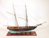 Label TextGideon H.S. Hevenor, a well-known model maker from Waltham, Massachusetts, made this model of the brigantine SWIFT, which served as an American privateer during the Revolutionary War. In May 1941, during the dark early days of World War II, Hevenor sent this model to President Roosevelt as a gift. In a note that accompanied the model, he wrote that he believed it was symbolic of a spirit of liberty and justice that would rise again.The model is accompanied by a larger wooden base (stored separately) which has a perimeter groove to allow for the placement of a protective bonnet.