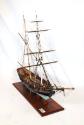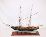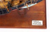 DescriptionA small wooden model believed to be of the 1779 American privateer, SWIFT. It is made from plans supposed to have come from the Archives of the British Admiralty. The ship has a black and green hull with red trim and fairly elaborate deck details. The rigging follows the general type in use at the time. There are no sails. The model is mounted to a wood base to which is attached a small white plaque inscribed: American / Privateer / Swift 1779 / by G.H.S. Hevenor.