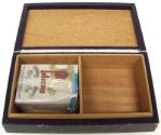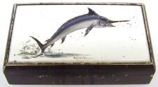 Descriptiona) A cigarette box with a painted cover image on porcelain tile of a swordfish jumping out of the water. The artist's signature is below the image: Reinbold. The box is covered with gold-trimmed blue leather. The interior of the box is lined with unstained wood and has two compartments.