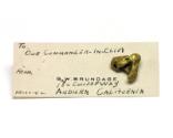 DescriptionA small, "V"-shaped ¼ oz. gold nugget mounted for use as a lapel pin. The pin is attached to a small piece of white cardstock on which is a handwritten and printed message in black ink that reads: To / Our Commander-in-Chief / From / G. W. BRUNDGAGE / 182 College Way / Auburn California / 10-22-42.
