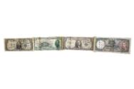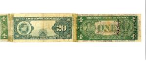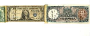 DescriptionFour short snorter bills taped together. The bills consist of two U.S. $1.00 silver certificates, one Venezuelan $20.00 bill, and one 5 shilling note from Fiji. Each of the bills are covered with handwritten ink signatures.