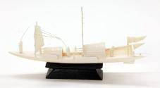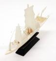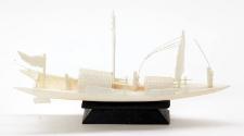 DescriptionA small model of a Chinese junk. Carved from ivory, the boat has two sails, one flag (at the back), and three figures, each holding a long pole. The model is fixed to a black-painted wooden stand.